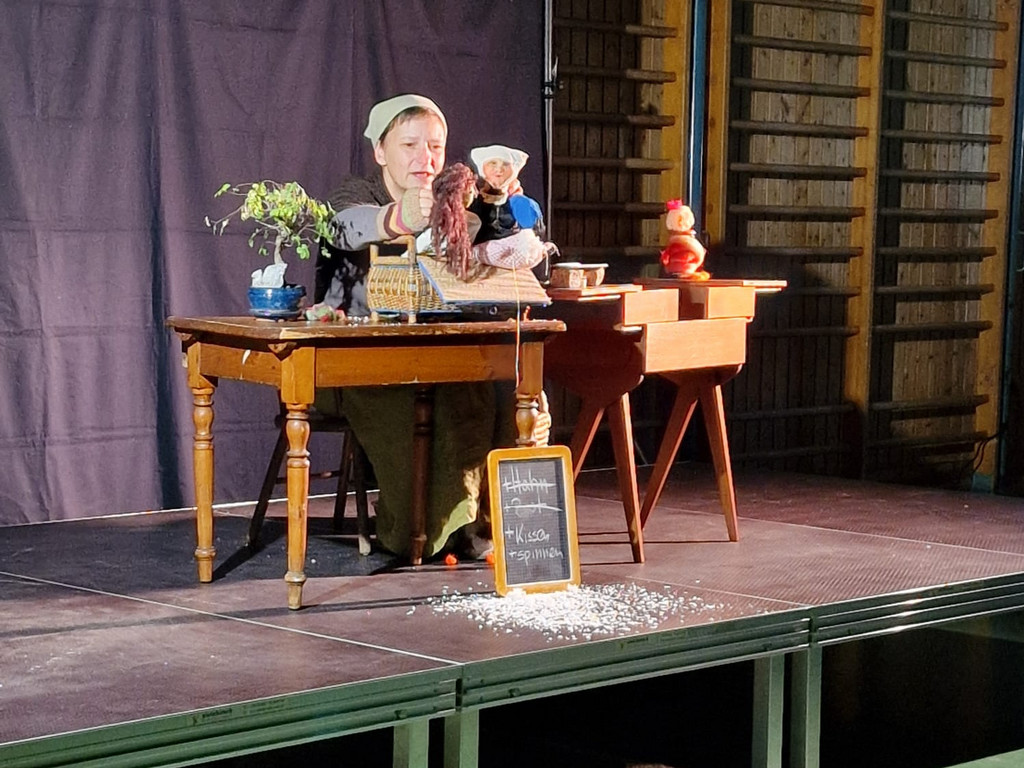 Wir hören das Märchen von Frau Holle, staunen über die lebendig wirkenden Figuren und den flexiblen Einsatz der Requisiten, die mit einfachen Griffen zu neuen Orten werden.