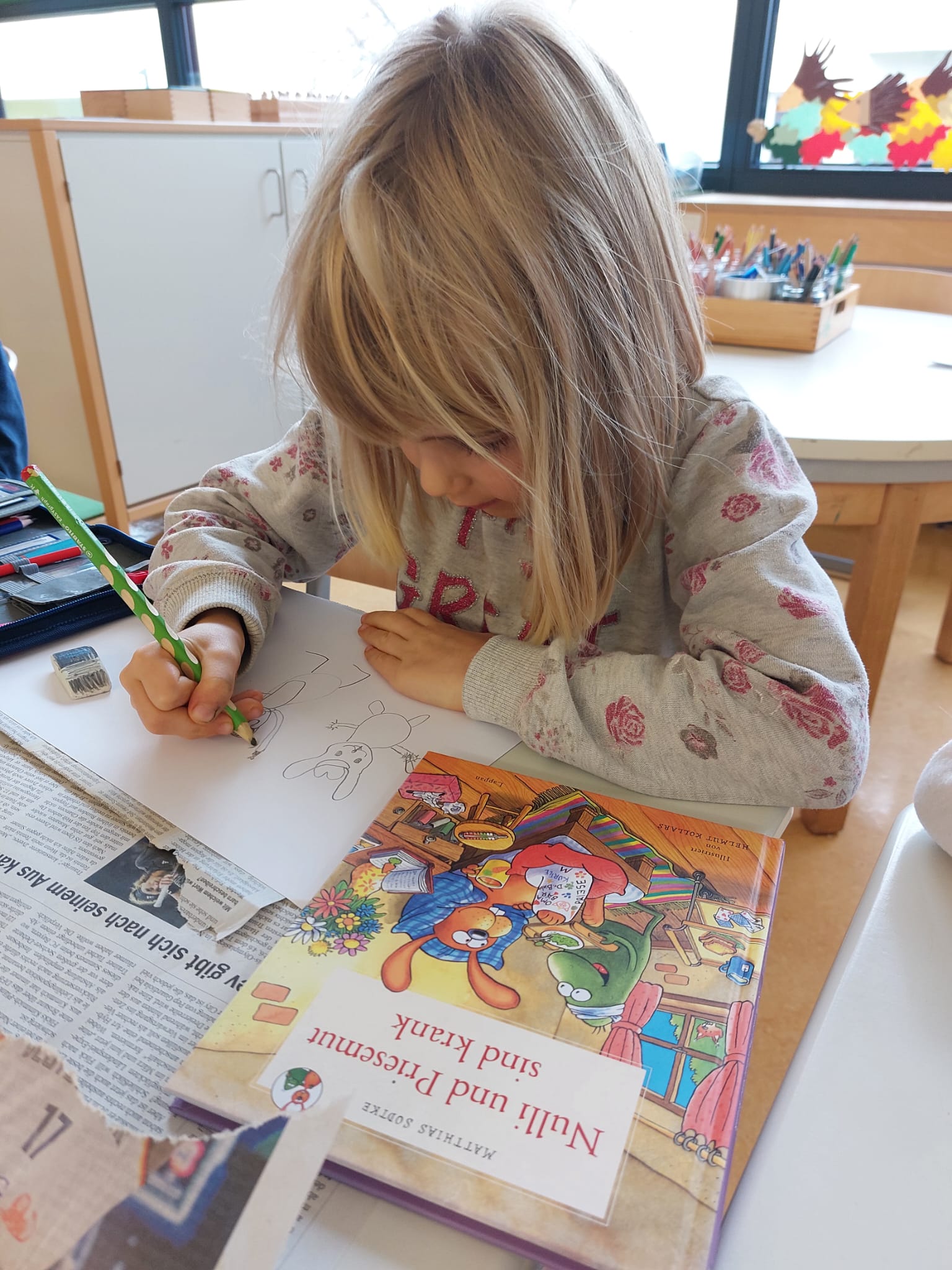 Buch und Kunst: Die Kinder zeichnen und malen zu Geschichten.