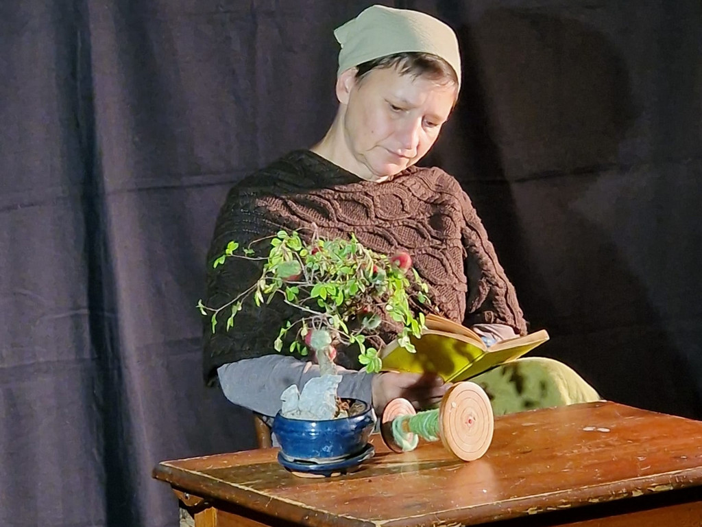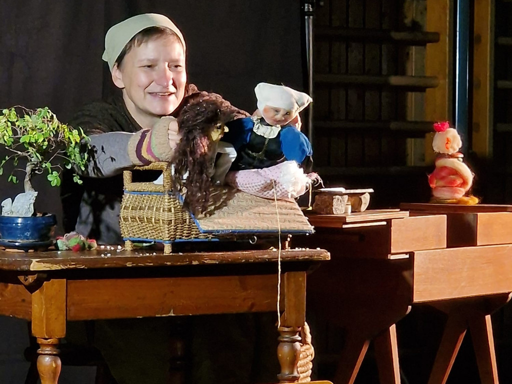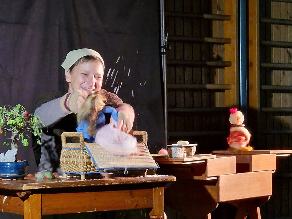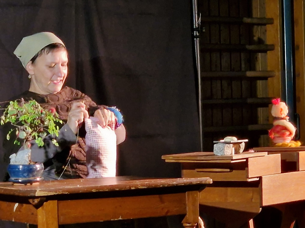 Wir hören das Märchen von Frau Holle, staunen über die lebendig wirkenden Figuren und den flexiblen Einsatz der Requisiten, die mit einfachen Griffen zu neuen Orten werden.